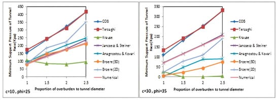 As shown in Figure 7, in this method, the minimum support pressure is calculated for a tunnel in non-cohesive soils without any support. The authors considered two limit states, of a tunnel excavation in lightweight soil with a surface load qs and tunneling in soil with γ > 0 and without any surface load, and presented two relationships for the lower limit and one relationship for the upper limit. In these relationships, the surface load and overburden do not have any influence on the face pressure. For cases where C,φ > 0, it could be shown that the minimum support pressure of the tunnel face is obtained by Equation (11) [,]: