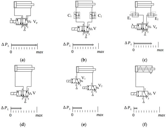 Starting from Figure 1a, the flows into and out of the cylinder are metered at the proportional valve, Vp, so that throttling losses take place at both ends of the cylinder. A more efficient solution is shown in Figure 1b, at the expense of losing the electronic spool-position control of the main valve, V, which, now, can only be set to two fixed states. The one-way flow-control valves, C1 and C2, are placed in such a way that flow metering takes place at only one of the cylinder ports. Piston extension is thus affected by valve C1, as the output cylinder flow is bypassed at valve C2. Likewise, valve C2 is responsible for controlling the piston during retraction. Figure 1c shows an even better arrangement, with two quick-exhaust valves, E1 and E2, which short-circuit the low-pressure port of the cylinder directly into the atmosphere, thus avoiding the longer way through the main valve. Figure 1d,e are somewhat equivalent in terms of pressure losses, with (maybe) some slight advantage to the circuit in Figure 1e, where valves can be attached to the cylinder ports, thus, eliminating the hoses. Finally, Figure 1f presents a single-acting cylinder with the on–off control from the piston-side only. This is the scenario where less throttling losses are observed, although applications are limited to some particular cases. We do not cover single-rod cylinders in this paper.