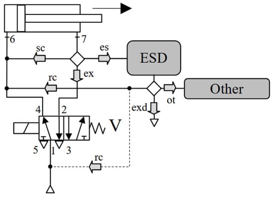 - Energy-storage path (es). The flow from port 7 is stored in an Energy Storage Device, ESD (an accumulator, for example) for later reuse in other applications (path ot) or the same cylinder (paths rc). It is also possible to discharge the stored energy into the atmosphere, if necessary (path exd). Examples of circuits following paths rc are found in [8,13]. In these references, exhaust energy is captured at port 3 of valve V, instead of being captured at the cylinder port, 7. Reductions in air consumption of up to 37% have been reported in a multi-actuator circuit [14].