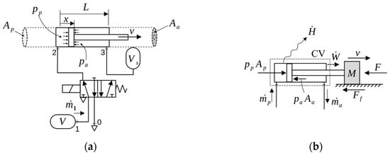 We have seen that the circuit in Figure 1d, with no throttling control of the cylinder velocity, is one in which energy losses are minimal. Our aim in this section is to briefly discuss whether reusing the exhaust air flow can improve the energy efficiency of that circuit even more. In our approach to the problem, we consider the simple circuit in Figure 3a,b, where the piston extends at a velocity . The figure mixes pneumatic symbols with some additional drawings to help us develop our theory.