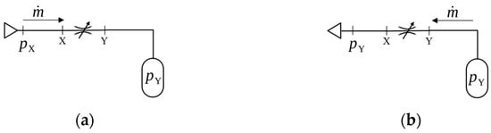 The keywords “charging” and “discharging” in Equation (22) are related to the experiment published in [29], according to the circuit shown in Figure 4, where an air tank is charged (Figure 4a) and discharged (Figure 4b). The first equation in (22) applies to the situation in Figure 4a, while the second equation applies to Figure 4b. This poses a difficulty when dealing with more elaborate circuits, where valves are not necessarily connected to air tanks in the same way. How do we determine whether the situation is one of “charging” or “discharging”, in such cases? One way of approaching this problem is by observing if one side of the valve is connected to the exhaust line, in which case, we could assume that air is discharging through the valve. On the other hand, when one side of the valve is connected to the pressurized line, we can say that the air through the valve will be pressurizing some part of the circuit (for example, the cylinder chamber). In any case, it is not easy to automatize the process of choosing which equation to be used. Considering this aspect, using Equation (20) instead of Equation (22) circumvents this problem, since they can be equally applied regardless of the physical process.