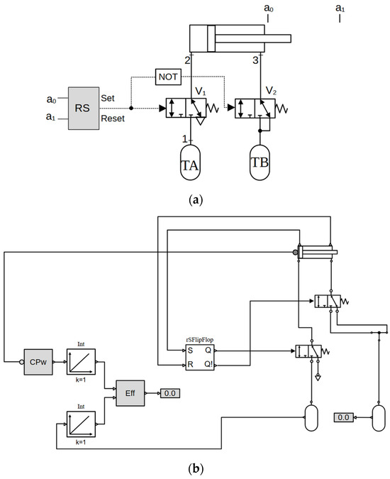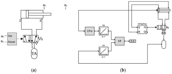 It is important to note that the same flip-flop controller is used for the 5 × 2 and 2 × 2 directional valves. Therefore, to preserve a single connection between the controller and the valve, we use the Modelica function “not”, at the negation port of the flip-flop controller (not Q! equals Q, in Boolean algebra). As for the rest, the circuit in Figure 7b is similar to the circuit in Figure 5b and demands no further explanation.