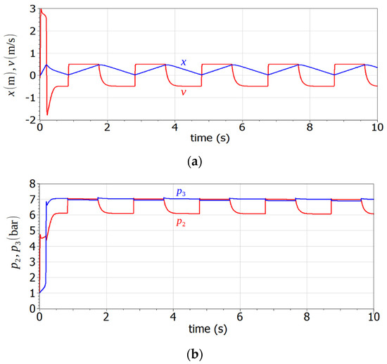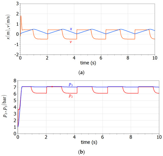 Figure 6a shows the evolution in time of the piston displacement and velocity and Figure 6b shows the cap- and rod-side pressures (steady-state is reached after, approximately, 0.5 s). We cannot be sure whether the created library is precise in representing the real situation (no experimental data have been collected for this paper), but the simulation is obviously coherent with the actual circuit behavior.