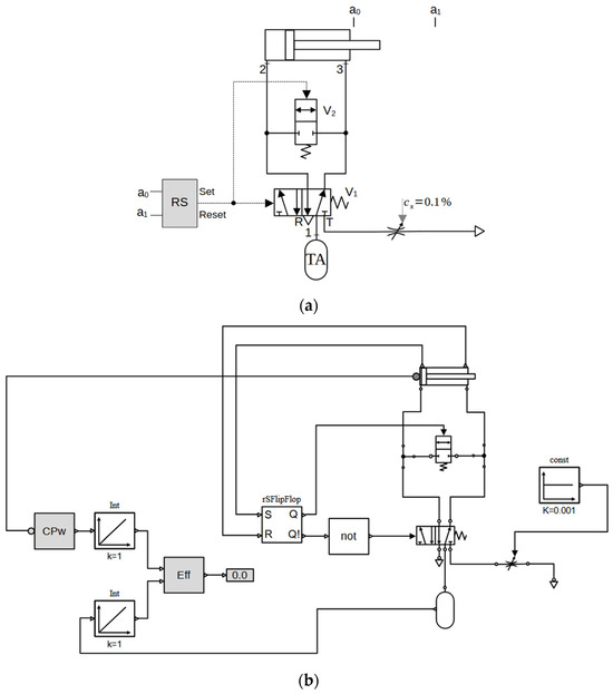 Figure 5b shows that the cylinder has three outputs: two are represented as triangles on the top, and the third one is depicted as a filled circle on the left. The triangles output logical values, which are the signals from sensors and , respectively, whereas the circle is a real-vector output, containing several cylinder data, among which the cylinder power (Equation (6)), which is filtered out by another function of the pneumatic library, represented as “CPw”. The air tank also has one output, which is a real number containing the fluid power from the tank (Equation (7)). Both the “CPw” and the tank output need to be integrated prior to being passed to the “Eff” function, which calculates the efficiency from Equation (8). Two Modelica integrators perform this task, integrating between and (). Finally, the flip-flop controller from the Modelica library receives the signals from and and outputs the control signal to the directional valve.