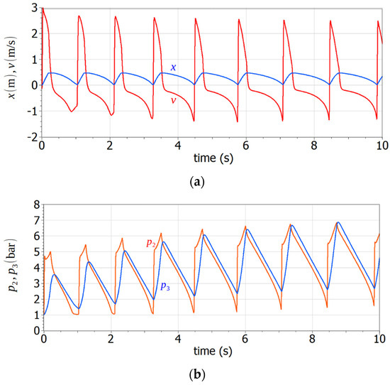 Figure 10a,b show the piston velocity, displacement and pressures at ports 2 and 3 of the cylinder. If we compare the results with those in Figure 6 and Figure 8, we notice the nonuniform velocity and pressure patterns, caused by the presence of tank TB. In fact, the volume attached to port 3 of the cylinder creates a nonlinear resistance to the piston motion, with a direct effect on the piston velocity. Likewise, the discharge of tank TB will not produce a constant pressure on the rod-side chamber (the same is also true for tank TA, but the difference in volumes is significant, so that it seems that the discharge of TA into the piston chamber takes place at an almost constant pressure). The irregular velocity pattern causes a significant difference between extension and retraction times, as seen in a. This might be prohibitive in actual circuits, creating a need for more elaborate circuits and control strategies, which ultimately results in higher costs.