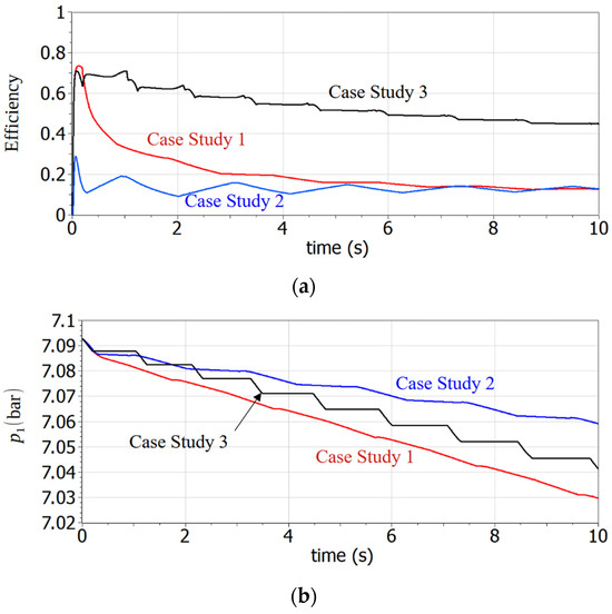 Time evolution of (a) circuit efficiency and (b) pressure at the port 1 of tanks, TA, for the three circuits examined in this paper.