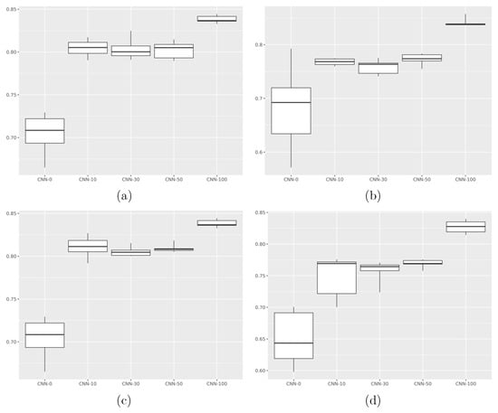 Performance of each model, with respect to (a) accuracy, (b) precision, (c) recall, (d) F1 score. CNN-0 performs significantly worse than other models with respect to accuracy, recall, and F1 score (, , , respectively, for all other models), while CNN-100 performs significantly better than all other models with respect to accuracy, precision, recall, and F1 score (, , , , respectively, for all other models). ANOVA comparing the three models with different amounts of shared data revealed no significant difference across all metrics ().