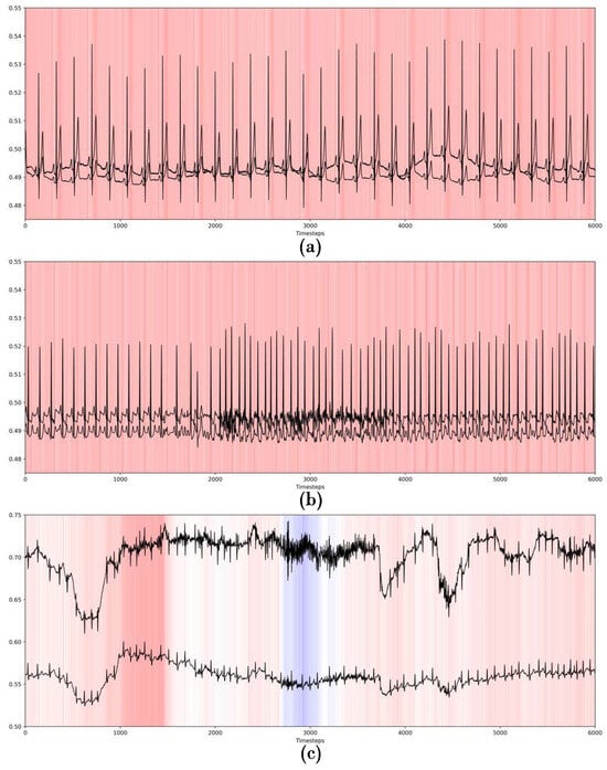 Examples of GradCAM with the trained CNN-30 model on the CPSC 2021 dataset, for a (a) non-pathological ECG, (b) ECG showing pAF, and (c) ECG showing npAF.