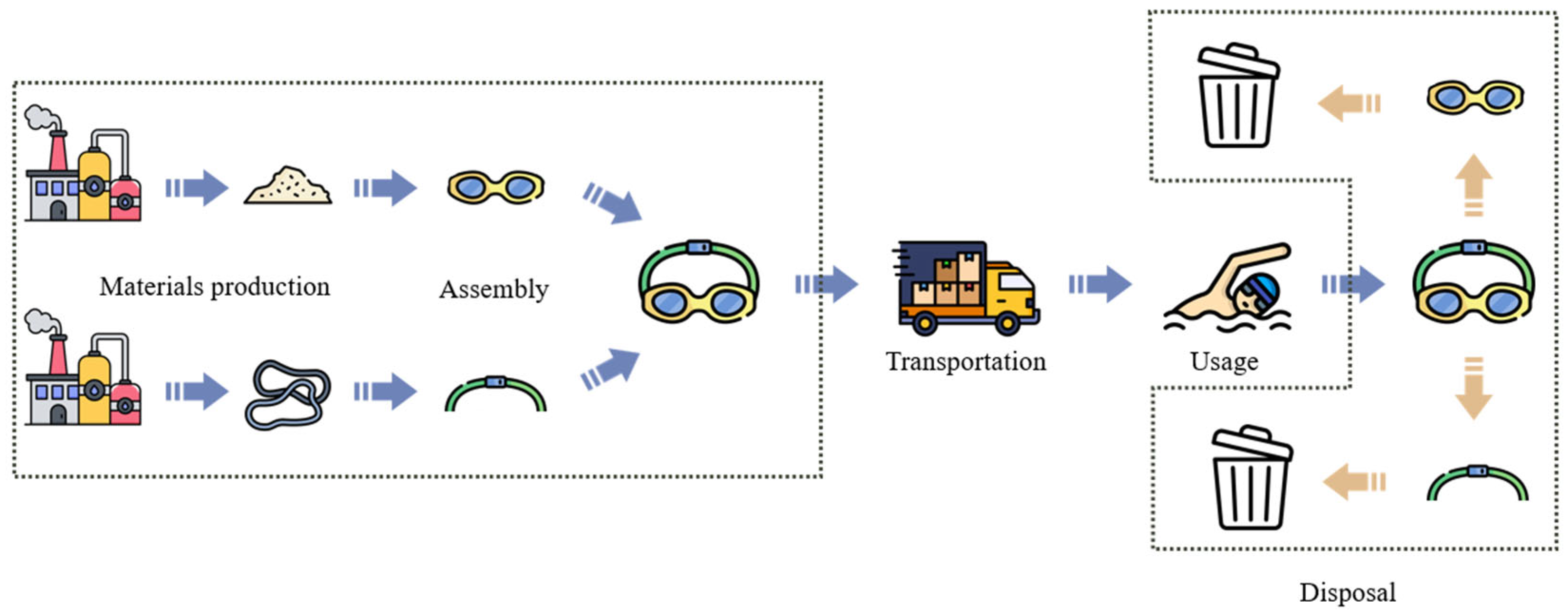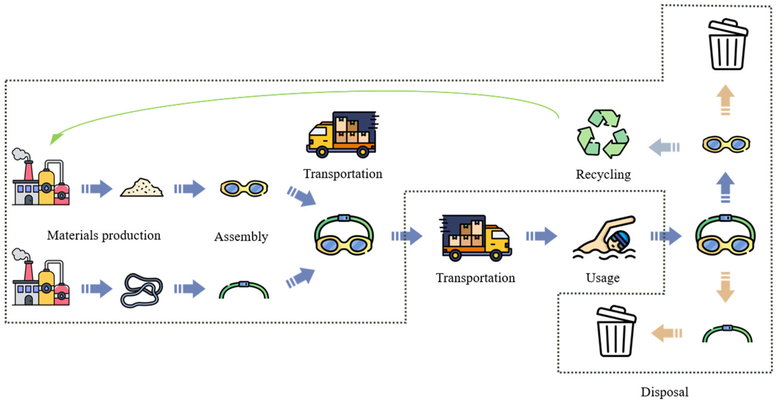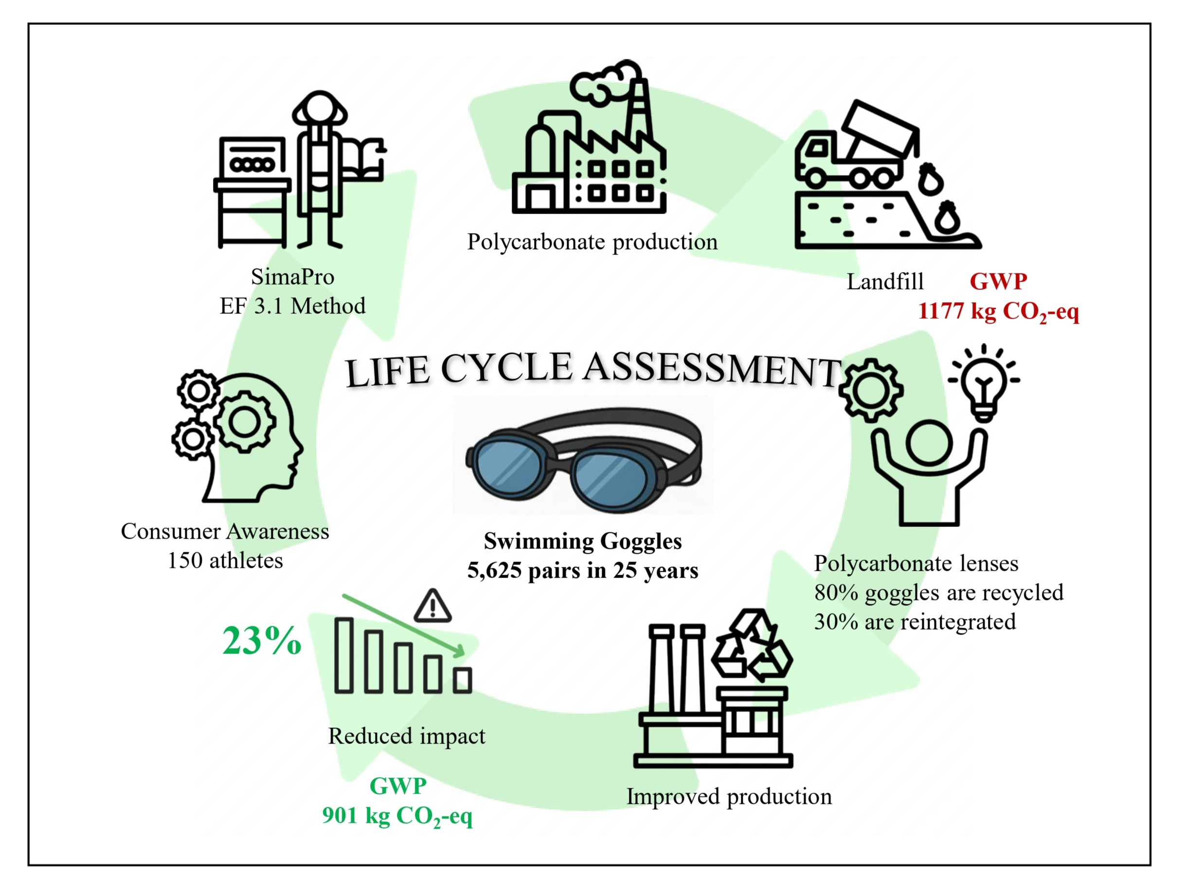 - Assess the environmental impact of swimming goggles across their production and disposal phases, comparing virgin and recycled polycarbonate, to evaluate whether recycling significantly reduces their ecological footprint.