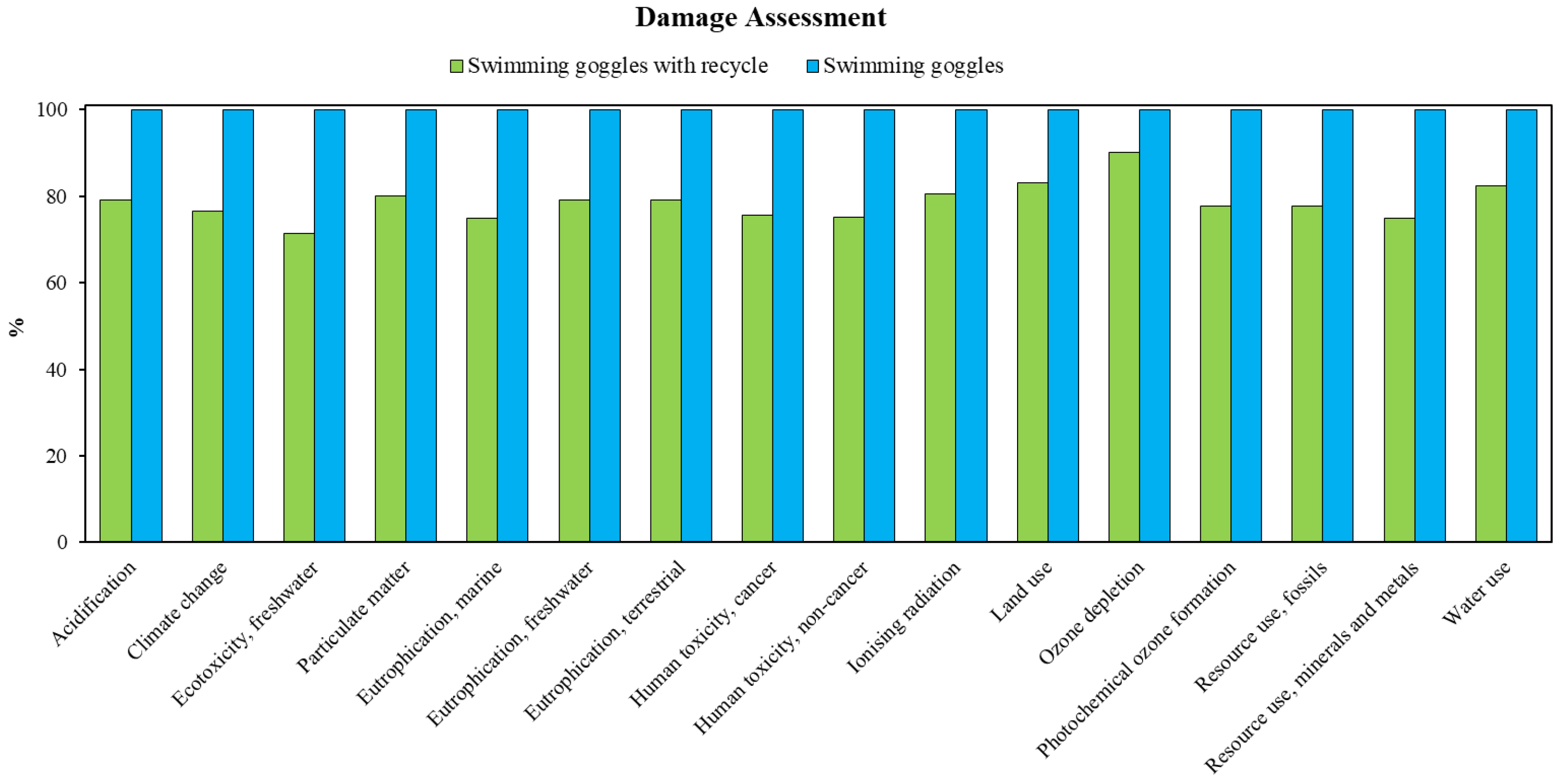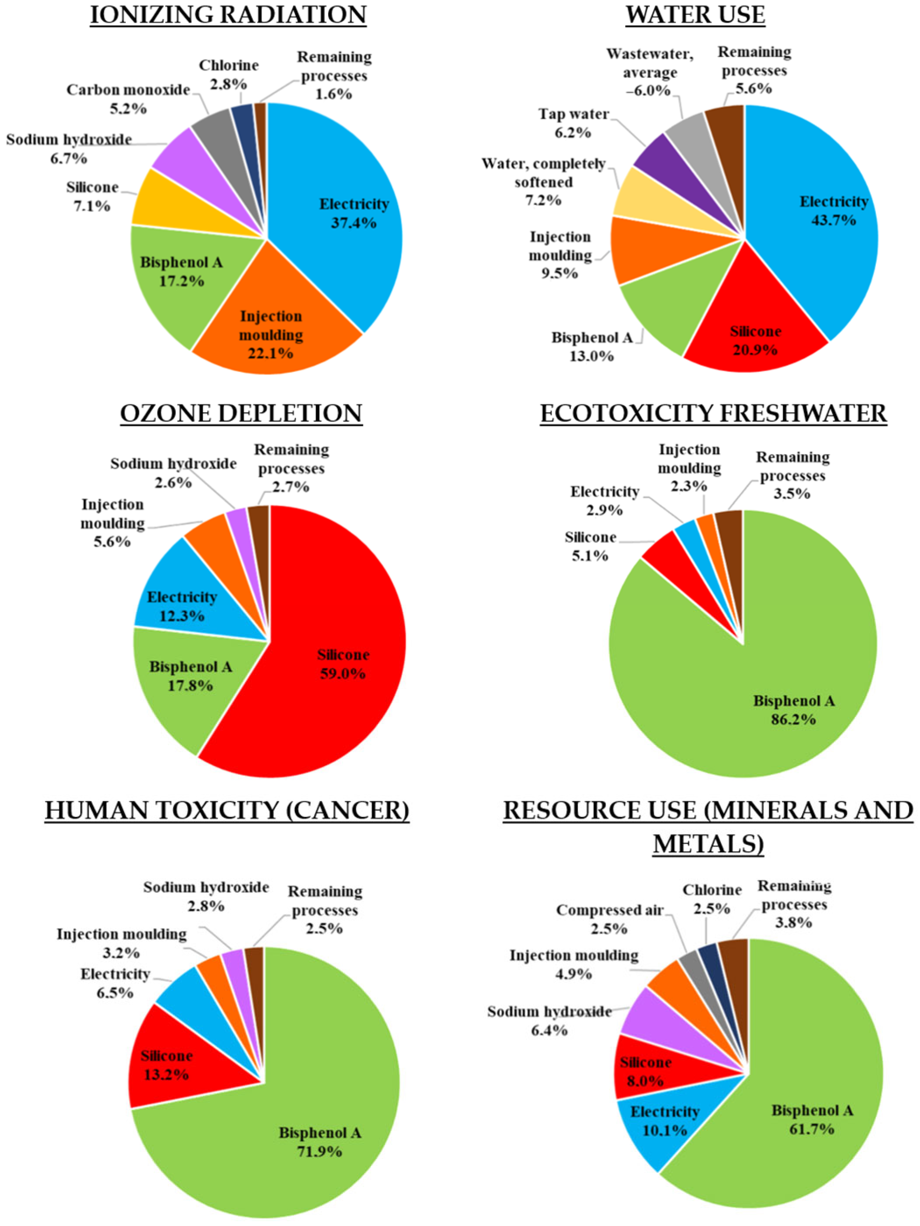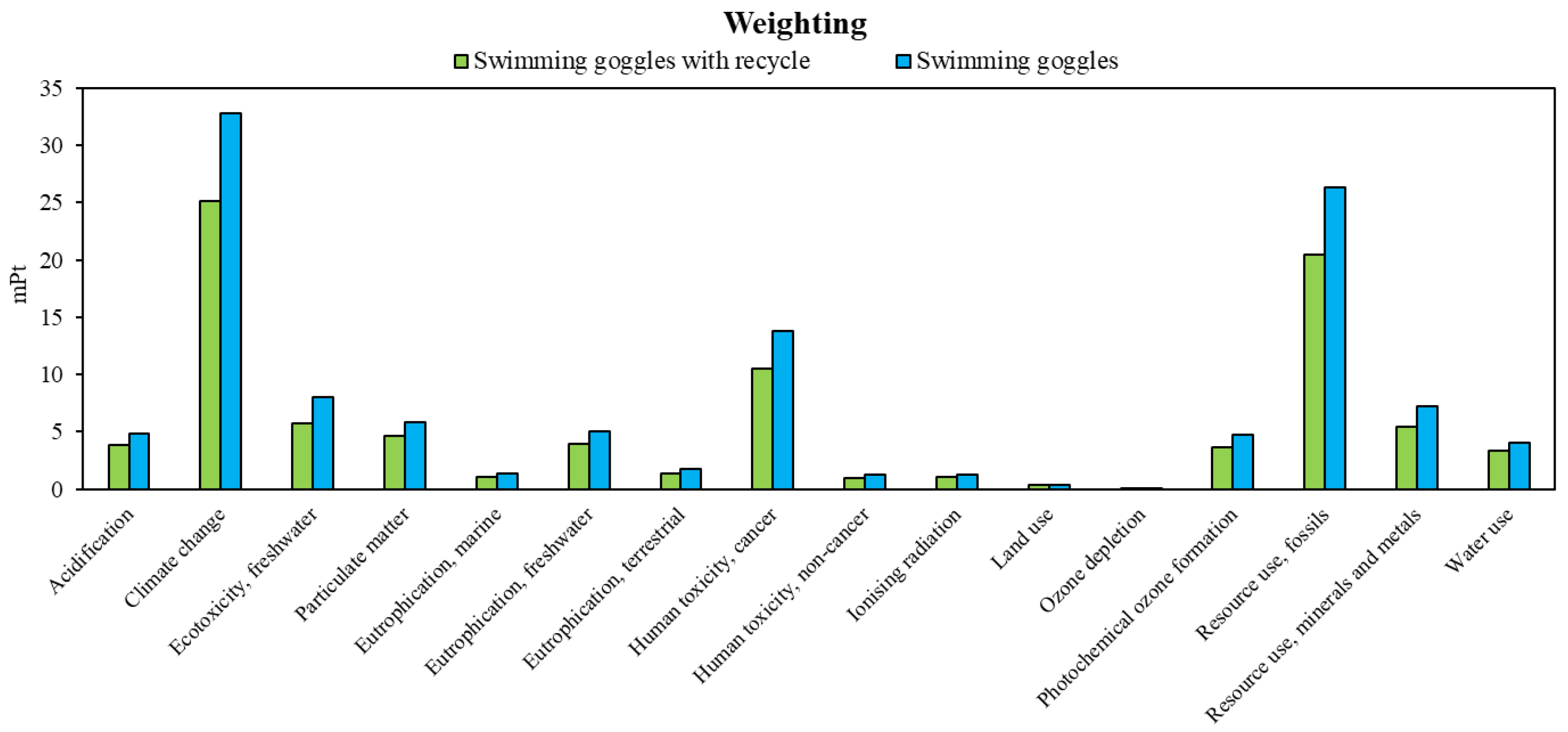 3.3. Life Cycle Impact Assessment Results—Swimming Goggles with 30% Recycling Materials