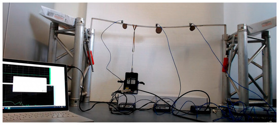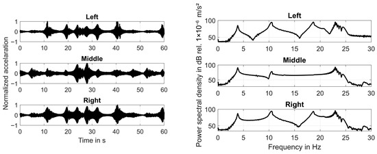 As also shown in Figure 1, three ordinary acceleration sensors (labeled with “Left”, “Middle”, and “Right”, each having a weight of approximately 0.01 kg) are connected to the horizontal part of the frame structure. The structure is driven by an electro-dynamical exciter. The connection between the structure and actuator is established by a soft rubber band. The excitation signal is generated by the soundcard of an ordinary personal computer using a sampling rate of 44.1 kHz. All cables have been arranged in such a way that any friction between structure and cable has been avoided. Some more details about the measurement equipment are given in Appendix A.