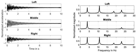 At first the system response to a step-input signal (manually applied by hand) has been analyzed. Only the system outputs have been determined. The results are shown in Figure 2. The time-domain response is shown on the left, considering the acceleration signals normalized to the peak value for each channel. The associated magnitudes of the Fourier spectra are shown on the right. The latter are also normalized to the maximum value.