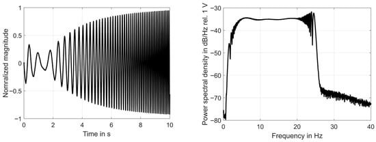 Because the highest natural frequency is below 25 Hz, the frequency range for the excitation signal is between 0 Hz and 25 Hz. It can be seen that the magnitude of the excitation signal is constant over the main part of the analyzed frequency range.