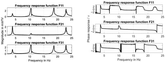 In order to identify both natural frequencies and the associated mode shapes, the frequency response functions (FRFs) have been determined. Magnitude response and phase response curves are shown in Figure 5. The associated real parts of the FRFs as well as the imaginary parts of the FRFs are shown in Figure 6. The resonance frequencies and the associated modes (identified on the basis of these FRFs) are listed in Table 2 and Table 3. All modes are normalized to the response measured at the “Left” sensor position. Please note that the spectral analysis presented in this paper is based on Welch’s method.