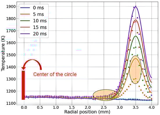 In Figure 1, pronounced discrepancies between the measured and simulated temperature profiles are evident. In particular, within the core of the directly heated zone, the temperature rises more slowly than predicted by the simulation. The largest discrepancy occurs at the center of the heated zone (3.5 mm) at 5 ms, with a difference of approximately 150 K between the simulation and the experimental measurement.