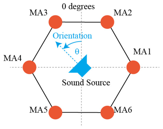 An objective of head orientation estimation is to find a direction where energy radiated from a sound source is maximum. When microphones are placed in all directions, we can find head orientation by selecting a microphone with maximum energy observed among all microphones. However, a required angular resolution is limited and the number of microphones M is also limited. When the angular resolution is , we have to discriminate kinds of directions. When , it is easy to estimate accurately. In this paper, we describe head orientation estimation under the condition of (i.e., and ). Figure 1 shows alignment of directional sound source and six microphone arrays. The black solid lines formed a hexagon show the alignment of microphones. The gray dashed lines are shown to represent that the directional sound source is located at the coordinate origin for convenience. Like this figure, microphone arrays, instead of microphones, are often used for head orientation estimation. Although the proposed method is based on six microphones, we compare our method with both microphone-based and microphone-array-based methods.