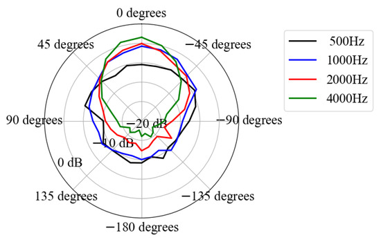 The radiation pattern from a directional sound source was created by measuring the impulse responses of points on a circle centered on the source point. A loudspeaker (GENELEC 8020DPM) was used as a directional sound source. The impulse response was measured on the azimuth plane at a height of 1 m above the floor. We placed the low-frequency speaker cone so that its center was away, and we measured the angle from to at 15-degree intervals around a circle with a radius of . The microphone used was an 8-channel circular microphone array called Kurage, manufactured by System In Frontier Inc., Tokyo, Japan [13]. Kurage means jellyfish in Japanese, and the microphone was named after it because of its jellyfish-like appearance when attached to the tripod. Kurage is equipped with a MEMS microphone element, and only channel 1 was used for measuring the impulse response. Channel 1 was positioned above the floor. The measurement signal used was a time-stretched pulse with a signal length of 32,768 samples. We applied 16 synchronous addition processes to the measurements and synchronized the playback of the measurement signals and recording them. A System In Frontier RASP-24 AD/DA converter was used for playback and recording, with a sampling rate of 48,000 Hz and a quantization bit depth of 24 bits. The measurement location was Osaka Sangyo University, Building 15, Laboratory 15806. The volume of the room is approximately , the background noise level is , and the reverberation time is about . The 1/3 octave band energy with center frequencies of , , , and was calculated from the impulse responses obtained at 15-degree intervals, and the radiation characteristics were calculated for each frequency band.