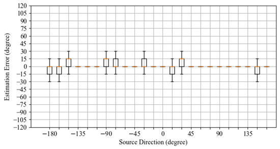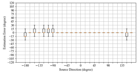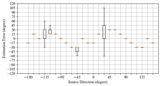 Figure 3 shows that the distribution of estimation errors tends to differ depending on the sound source direction. The second quartile ranges from to , depending on the direction of the sound source. There is more variability than in RAPM (Figure 4) and the proposed method (Figure 5). This is thought to be due to the effect of Equation (4). In this experiment, there were variations in the sound source direction, but the number of microphones was only six; .