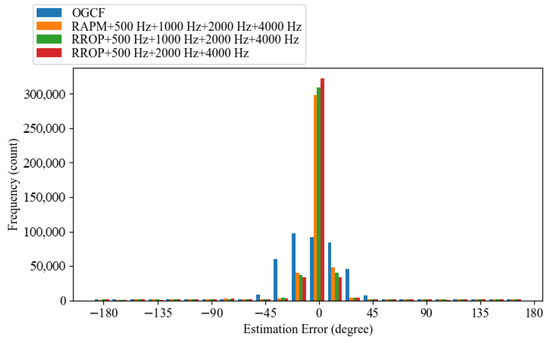 Next, the error distributions of the OGCF, RAPM, and the proposed method are compared from another viewpoint. The differences among these methods are shown in Table 1. We show the error distributions as histograms in Figure 6. The horizontal axis represents the estimation error, and the vertical axis represents the frequency. Since the 2400 audio files are composed of 427,104 frames, the total number of estimations is 427,104. We also compared derivative methods that applied multiple frequency bands to the proposed method. PROP is a proposed method that uses three bands with center frequencies: , , and . This method is the best according to the mean errors and mean absolute errors for all possible combinations in Table 2.