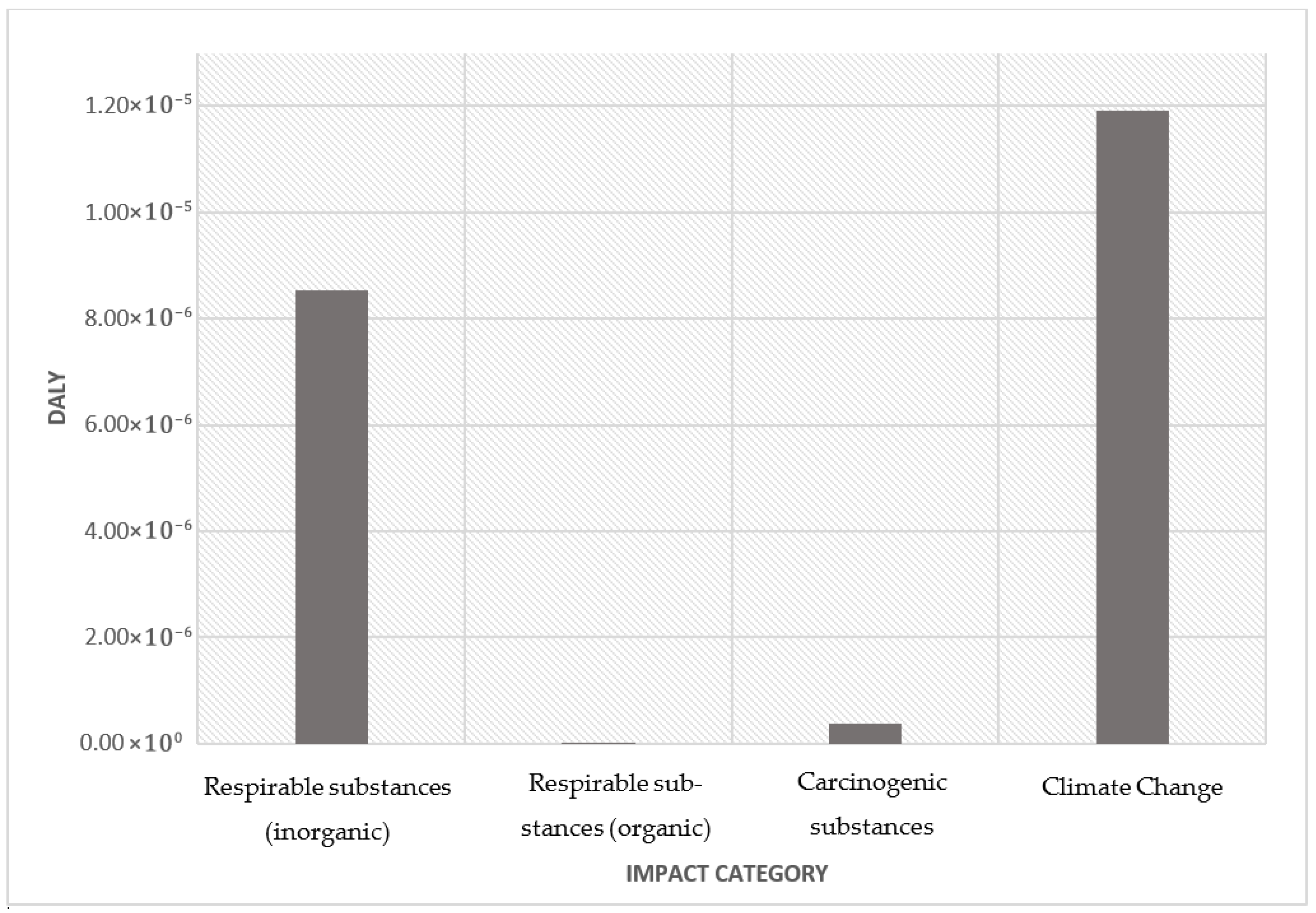 - Effects on human health (Human Health): The impact on human lives is assessed using the DALY (Disability Adjusted Life Years) indicator, which expresses the total number of years of life lost due to disability or premature death from exposure to toxic substances or other environmental burdens. The calculation is based on the number of years of disability, adjusted by a severity coefficient (0 for full health, 1 for death).