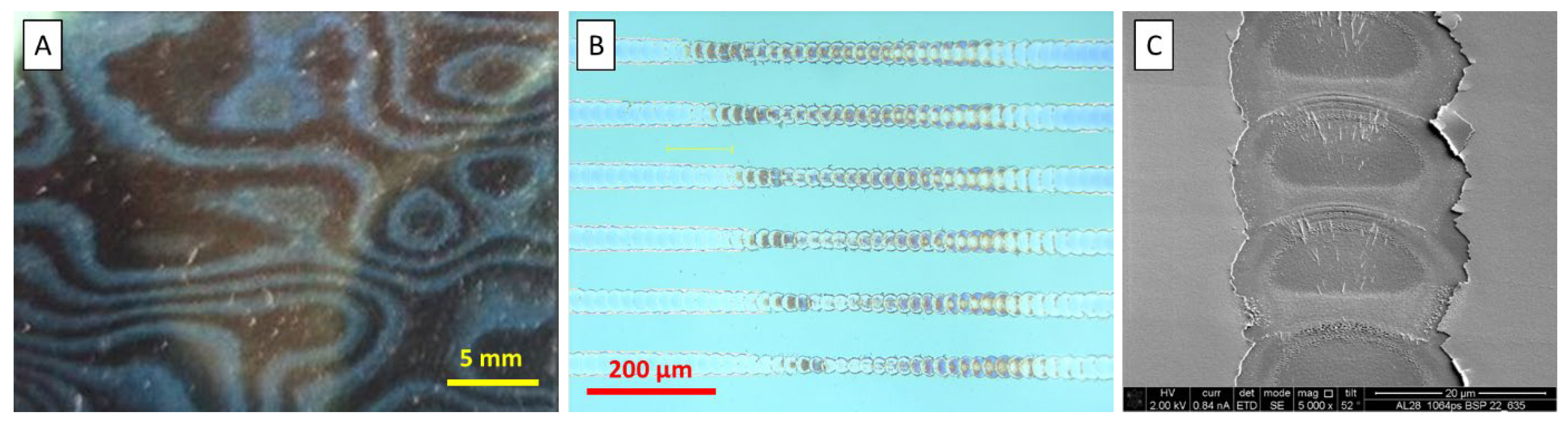 The observed ablation irregularities, when using the 1064 nm picosecond and 1030 nm femtosecond laser, are best described as local changes in ablation diameter and ablation depth within a single laser track. The pattern of irregularities seems to result from a large-scale effect originating within the samples since it spans multiple laser tracks over a large area and is independent of the ablation direction (see Figure 1). A scanning electron microscopy (SEM) image of an ablation track with full removal of the ITO and no damage to underlying SiN is shown in Figure 1C.