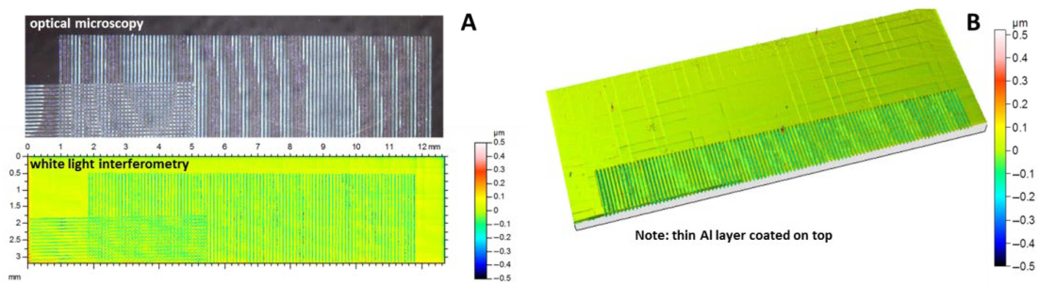 Figure 2. A comparison of the optical microscopy photograph with the image obtained on height variations, measured by white light interferometry (A). To ensure that the information is only obtained from the top surface of the sample and not at the other interfaces, a thin Al layer was evaporated on top, and the same scan of the sample was performed (B). The pattern observed in the laser tracks does not continue outside the laser area. Note: the rectangular pattern in the image is artificial and due to a stitching of many images.