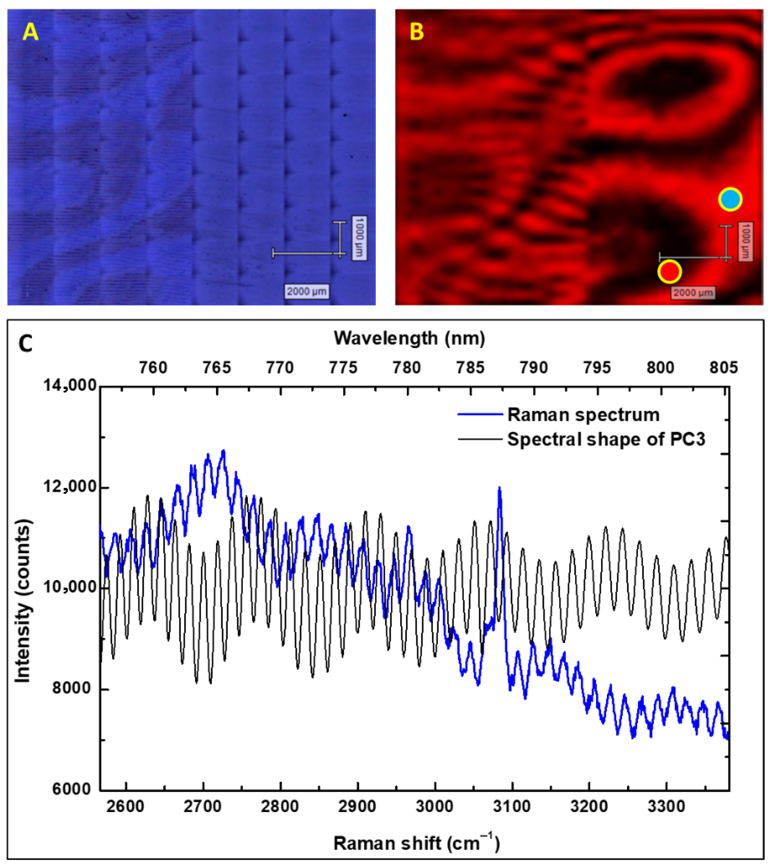 Figure 3. A stitched image obtained by optical microscopy of the area used for the Raman spectroscopy, showing laser tracks with ablation variations at the left-hand side and intact TC layer at the right-hand side (A). A score mapping of the third principal component, PC3(λ) (B), where the red dot is the location with the minimum score for PC3(λ) in the mapped area, and the blue dot is the maximum score location. The graph shows an example of the spectrum detected from a single point in the Raman mapping (C). For each pixel, a spectrum is recorded (blue line). This spectrum is mathematically split up in principal components. Here, principal component 3—PC3(λ)—is depicted by the black line, which is related to interference in the fluorescence signal.