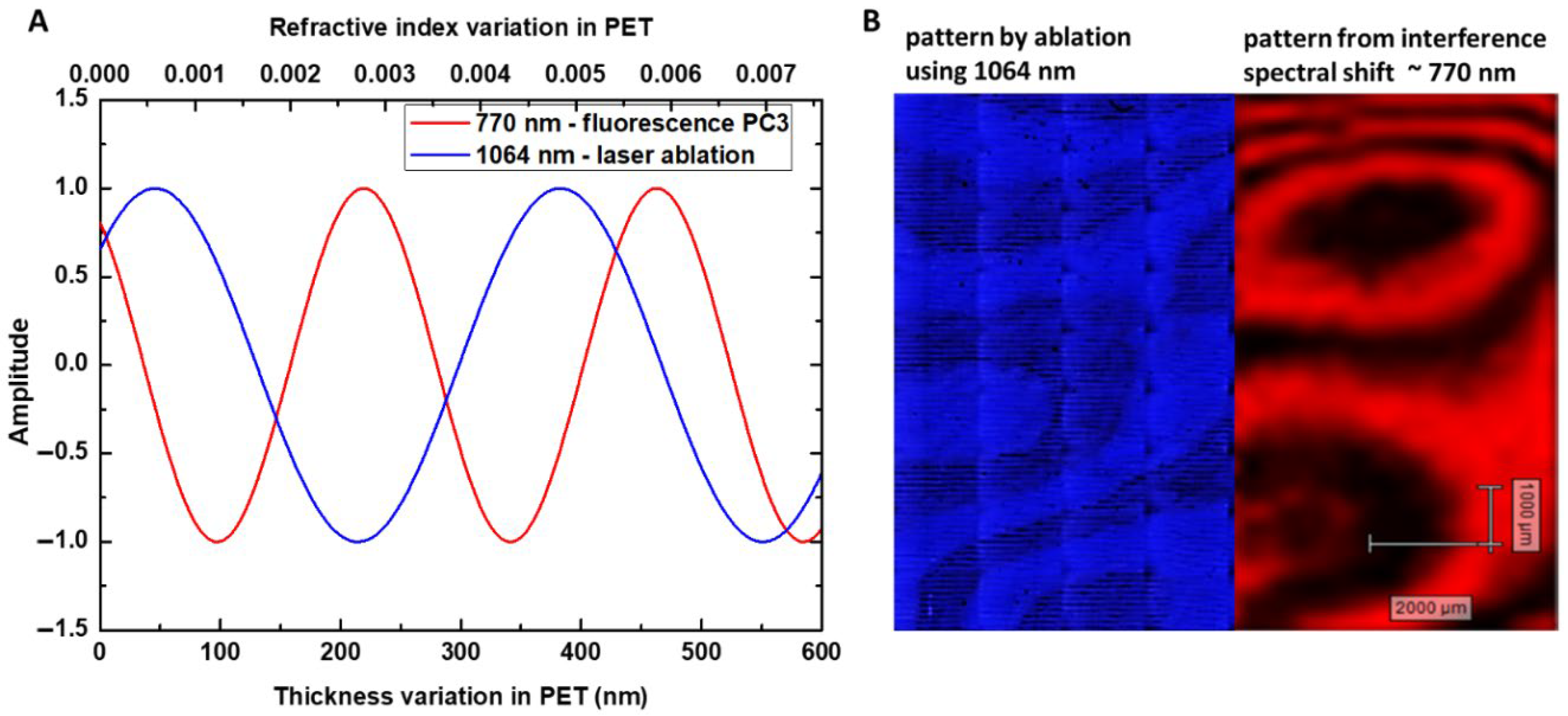 The obtained optical periodicity is represented in Figure 6A, where the sine function for 770 and 1064 nm is plotted as a function of potential thickness variations and refractive index variations in a 125 µm PET substrate. Clearly, a different periodicity is present between the observed fluorescence interference around 770 nm and that expected for 1064 nm laser ablation, where the periodicity for 1064 nm is approximately 1.4 times larger. This also implies that the large-area pattern observed by the PC3(λ) score mapping and that obtained by laser ablation are likely not identical. We verified this by combining the optical microscopy image of the 1064 nm laser patterned side of the sample in Figure 3A with that of the ~770 nm interference shift (PC3(λ) score) mapping at the un-patterned side in Figure 3B. The combined image is provided in Figure 6B. At the interface between the two images, we can see that the large-area pattern is indeed not identical; at some locations, a dark area in the optical microscopy image (corresponding to more damage by ablation) lines up with low values in the PC3(λ) score mapping and at other locations with a high value. In short, as expected, the periodicity in the large-area pattern is different for both wavelengths, and the periodicity of the pattern emerging from laser ablation is larger compared to that seen in the PC3(λ) score mapping. Despite having a different periodicity, both patterns observed at the two wavelengths originate from the same variations in optical path length in the PET substrate.