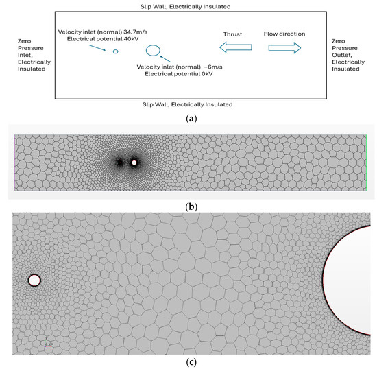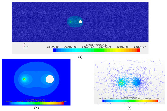 Further evaluation of mesh metrics such as skewness angle and face validity aids in identifying if there are any regions of poor resolution or distortion. The simulation is run as a steady-state solution. The model uses a segregated solver for its stability and versatility when solving steady-state simulations. Due to the low Reynolds number, the laminar model was chosen, and the density of the air was constant as 1.226 kg/m3. Because the modelling of the electromagnetic environment is an important part of the simulation, the optional electromagnetic module was added using electrohydrodynamic potential to model the passage of electric fields through the fluid.