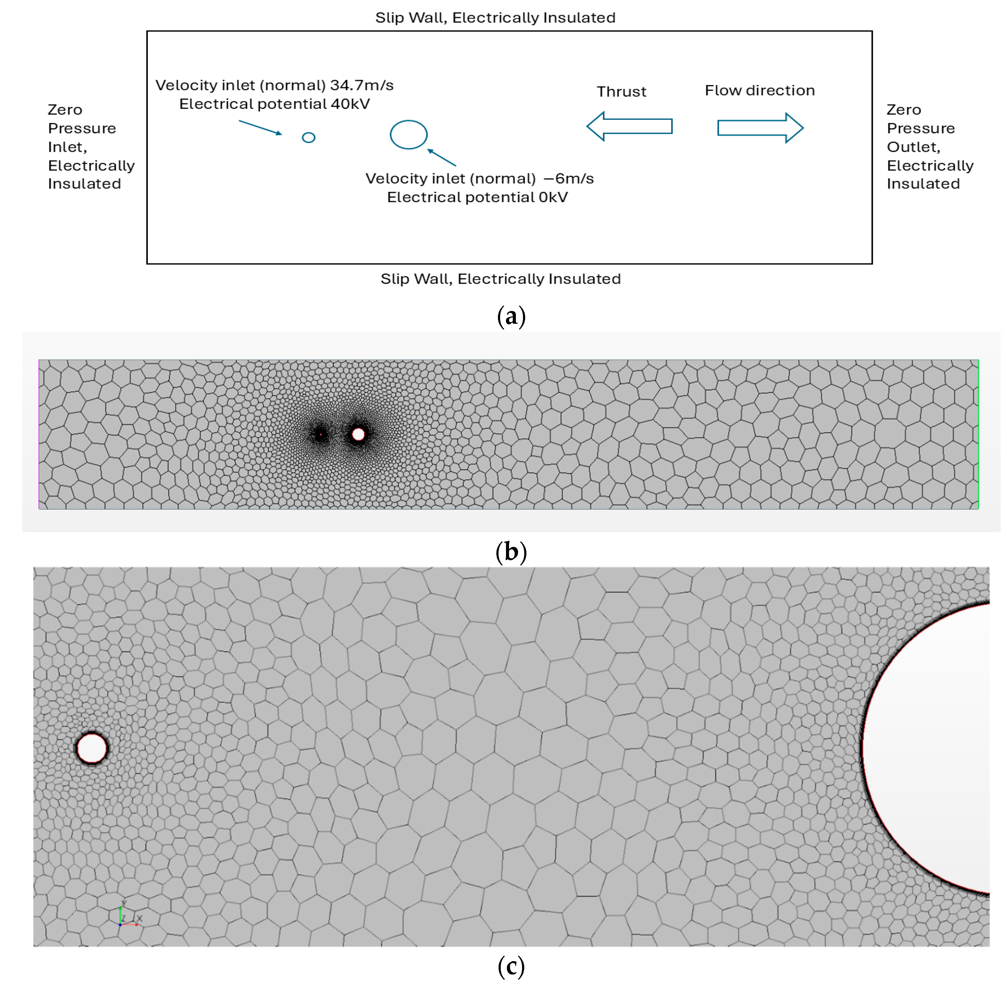 The domain used is two-dimensional and is a rectangular box of dimensions 40 mm × 250 mm. Standard atmospheric conditions were used. The emitter electrode was assumed to be a 0.025 mm circular cross-section, whereas a 2.5 mm circular cross-section diameter wire was used for the collector electrode. This equates to ionization regions for the emitter and collector of 0.16 mm and 1.6 mm, respectively. These values were used as circular boundary conditions, with velocity inlet being normal to the boundary of +34.7 m/s for the emitter and 6 m/s for the collector. Spacing of various lengths was applied between the two electrodes between 10 mm and 50 mm.