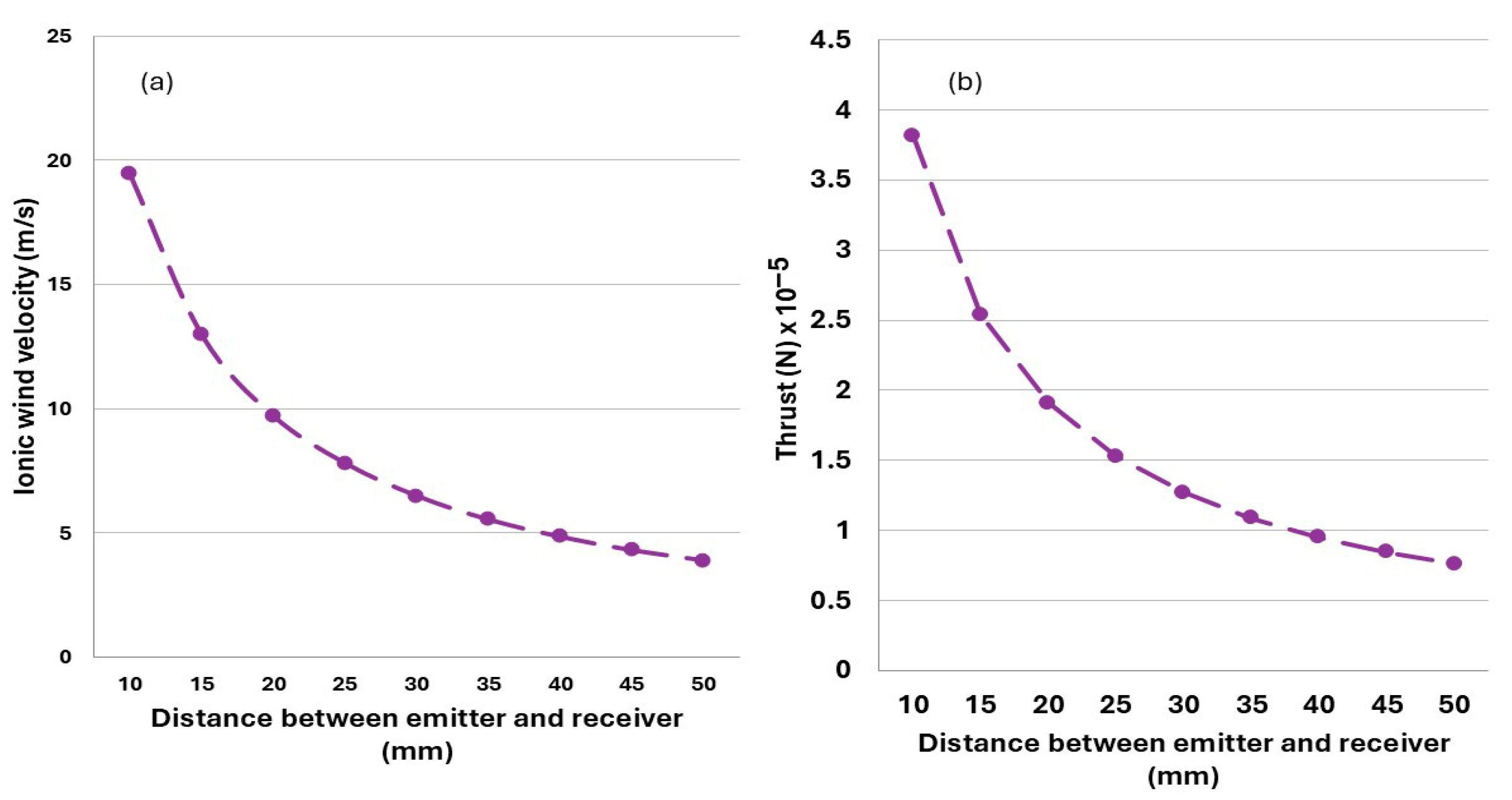 There are multiple factors that may affect the thrust produced during ionic propulsion. These factors need to be understood to maximize the thrust and to produce the ideal conditions for flying, for example, the distance between the anode and the cathode, more commonly referred to as the electrode spacing. Bouazza et al. [