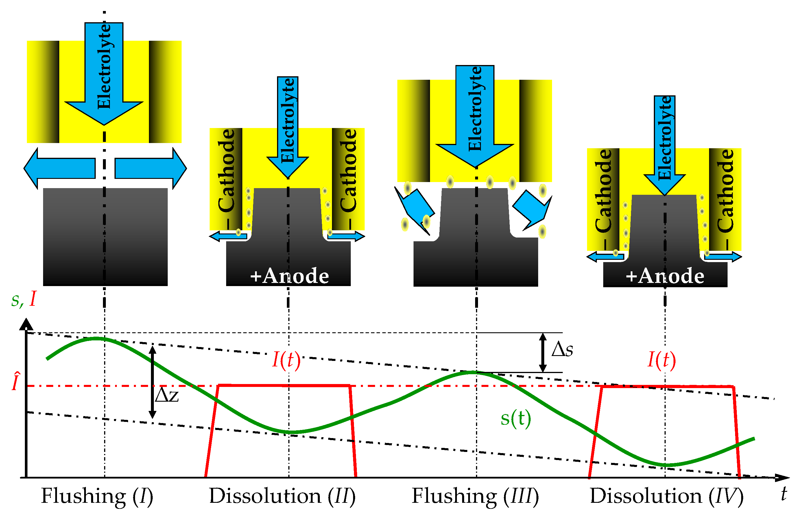 The graph illustrates continuous feed over time by dash-dotted, black lines; tool oscillation is highlighted by the green sinusoid; red trapezoids indicate current pulses at minimal working gap by synchronization with tool oscillation. Sections I–IV represent processing states, where I is the initial state at large working gap with high electrolyte supply rate indicated by blue arrows; II is the electrochemical dissolution process at minimal working gap offering high precision but low electrolyte supply; III is a flushing status at maximum gap, where reaction products (yellowish particles) are removed at through high electrolyte supply rate; IV represents the recurring electrochemical dissolution status, comparable to no. II, but on the pre-shaped workpiece.