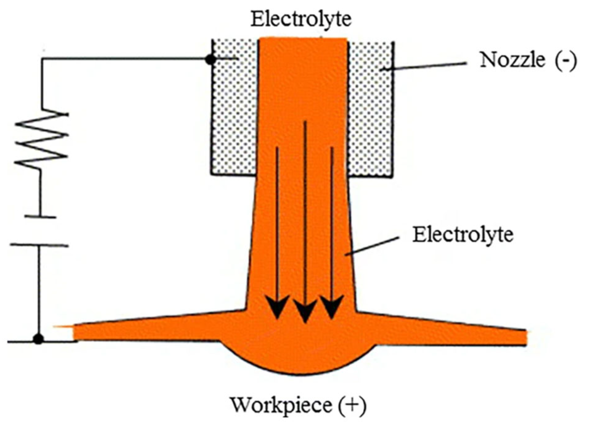 Figure 6 shows the principle of jet-ECM, where the electrically conductive workpiece becomes the anode and the nozzle becomes the cathode. The arrows indicate direction and averaged velocity of the electrolyte jet.