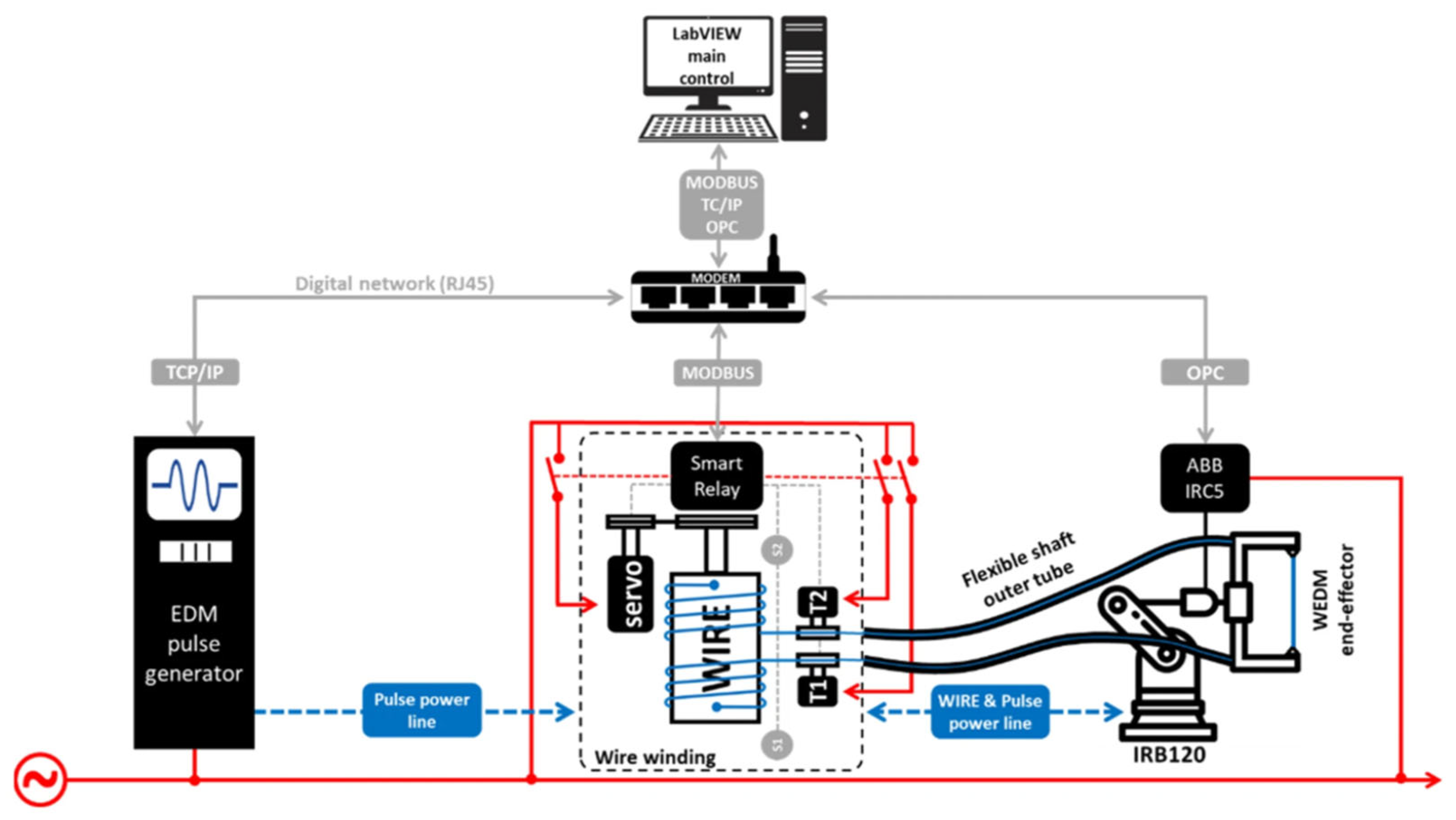 Figure 8) based on a high-speed winding system with 600 m of wire length, capable of controlling the wire speed from 1 to 10 m/s and wire tension from 0.1 to 10 N. The system adopts flexible outer cases to travel and reciprocate the wire into a 7-axis robotic system composed of a 6-axis robot and an external rotating axis. The proposed design is a highly dynamic process whose wire tension and speed are achieved by a hybrid controller to cope with the non-linear relation of speed and tension provided by the magnetic clutch. It combines a regression open-loop control for optimality and wire breakage avoidance with a closed-loop control to guarantee admissibility while coping with wire friction disturbances. The findings describe a novel wire winding system capable of controlling usual wire disturbance and stepped surface of reciprocating high-speed WEDM, as well as additional friction and elastic behavior of the flexible case, delivering wire tension of ±12% along with a stable EDM process and uniform surface roughness between wire reciprocation areas with a Ra of 2.94 μm. The red arrows depict the electrical power flow and control connections that supply and manage the EDM process.
