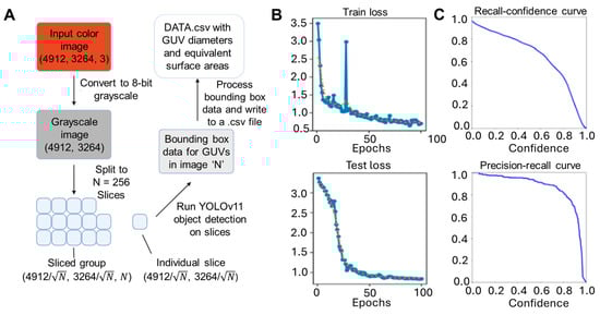 YOLO training methodology and optimization for AI GUV image analysis. (A) Overall workflow of training and test procedure on GUV microscopy datasets. Sample performance metrics depict the (B) convergence of the training and test losses (orange dots are simple moving average of every 3 blue dots) and (C) a sharp knee on the recall-confidence and precision-recall curves.