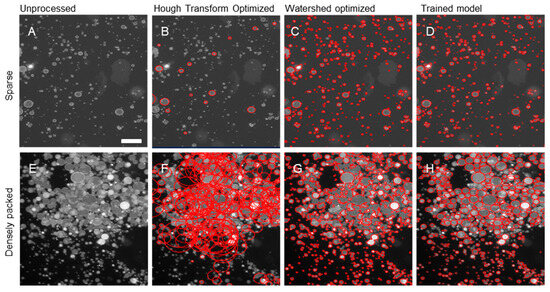Comparison of segmentation algorithms on sparse and densely packed fluorescence microscopy images (red circles indicate regions selected as GUVs by the code). (A) Unprocessed image of sparse GUV distribution. Corresponding (B) optimized Hough transform circles, (C) optimized watershed segmentation outlines, (D) trained AI (YOLOv11) model bounding ellipses. (E) Unprocessed image of dense GUV distribution. Corresponding (F) optimized Hough transform circles, (G) optimized watershed segmentation outlines, (H) trained AI (YOLOv11) model bounding ellipses. Scale bars are 25 μm.