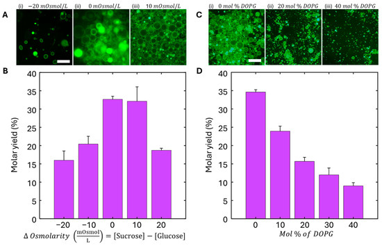 Effects of osmolarity gradient and lipid composition (DOPG percent) on GUV formation yield. (A) 32× fluorescent microscopy images of GUV yield under various osmolarity gradients (ΔOsmolarity = [sucrose] − [glucose]). (i) −20 mOsmol/L (ii) 0 mOsmol/L (iii) 10 mOsmol/L. (B) Normalized GUV yields as a function of ΔOsmolarity, showing the greatest yield around 0 to +10 mOsmol/L. (C) 32× fluorescent microscopy images of GUV prepared under varying mole fractions of DOPG. (i) 0 mol % DOPG (ii) 20 mol % DOPG (iii) 40 mol % DOPG. (D) Normalized GUV yields as a function of mole fraction of DOPG, representing a negative decrease in GUV yield as DOPG mole fraction increases. Scale bars for (A,C) are 25 μm.
