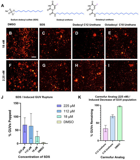 Effect of compound and concentration on GUV rupture. (A) Depicted are structures of carmofur analog test compounds dodecyl urethane and octadecyl urethane as well as the positive control compound SDS. Representative images of GUVs 60 min after addition of (B) 2.07% v/v DMSO, (C) 18 nM SDS, (D) 18 nΜ dodecyl urethane, (E) 18 nM octadecyl urethane, (F) 2.07% v/v DMSO, (G) 2.25 nM SDS, (H) 2.25 nM dodecyl urethane, (I) 2.25 nM octadecyl urethane. (J) Quantified percentage of GUV popped when GUVs are treated with a series of dilutions of sodium dodecyl sulfate (SDS) using the YOLOv11 CNN method. (K) Normalized, quantified percentage of identified GUVs remaining when GUVs are treated with 225 nM of dodecyl urethane and octadecyl urethane analogs of carmofur.