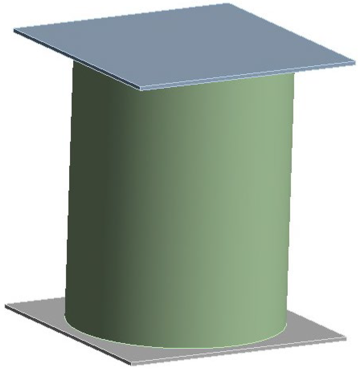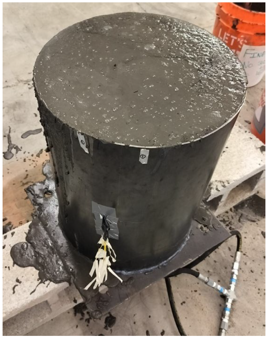 - Steel cylinders with UHPC confinement, as shown in Figure 3: UHPC was cast around the steel cylinders to assess structural enhancement capabilities, ensuring improved confinement and durability. After pouring the UHPC, a steel plate was placed on top and secured using four threaded rods and nuts, as shown in Figure 1a. The interface connection between steel and UHPC in the experimental configuration was governed primarily by mechanical interlock and adhesive friction developed during curing. No external bonding agents or anchors were used. Because UHPC undergoes early-age shrinkage, full chemical bonding at the interface was not expected. This informed the FEM decision to incorporate a shrinkage-induced gap.