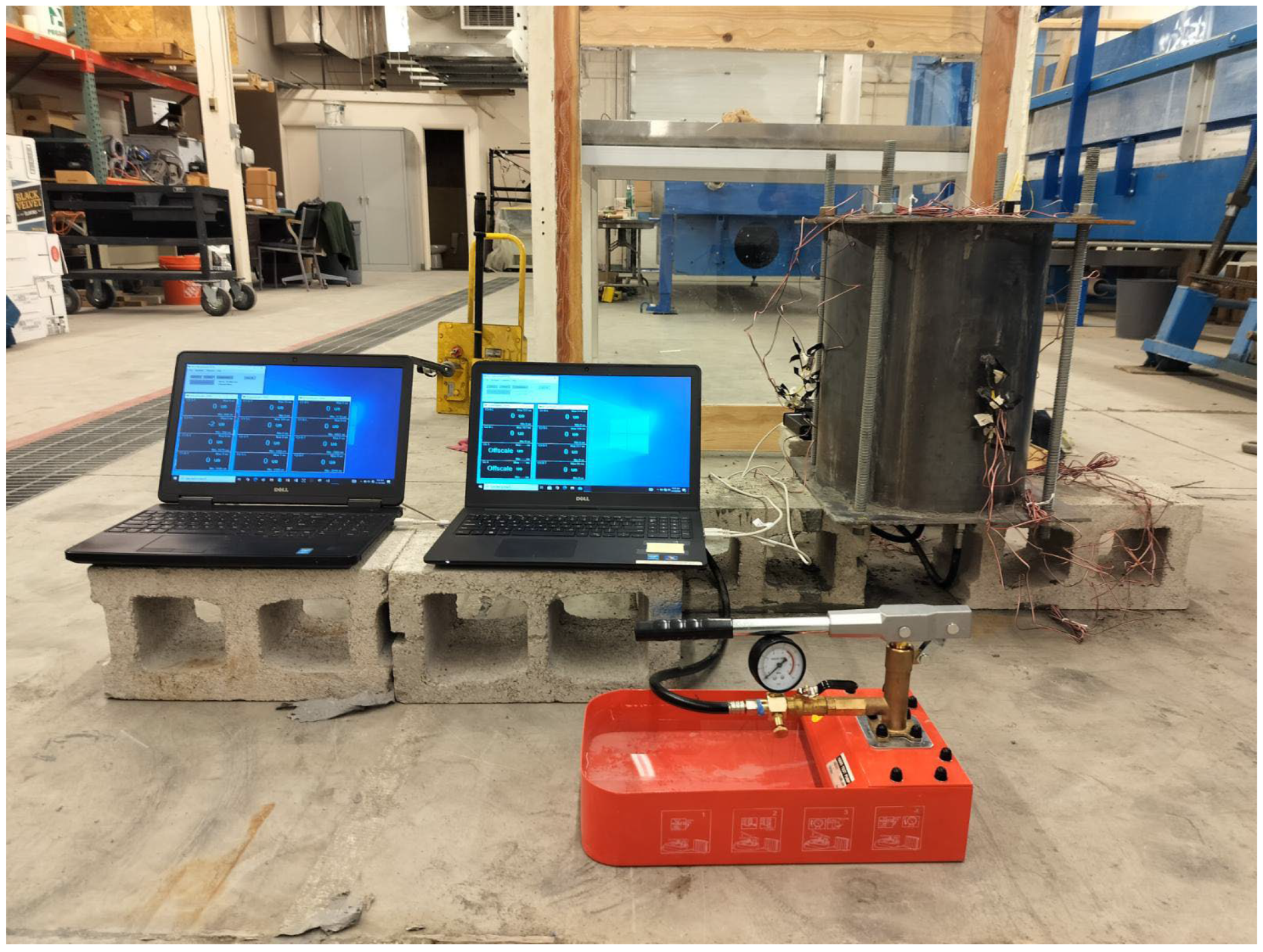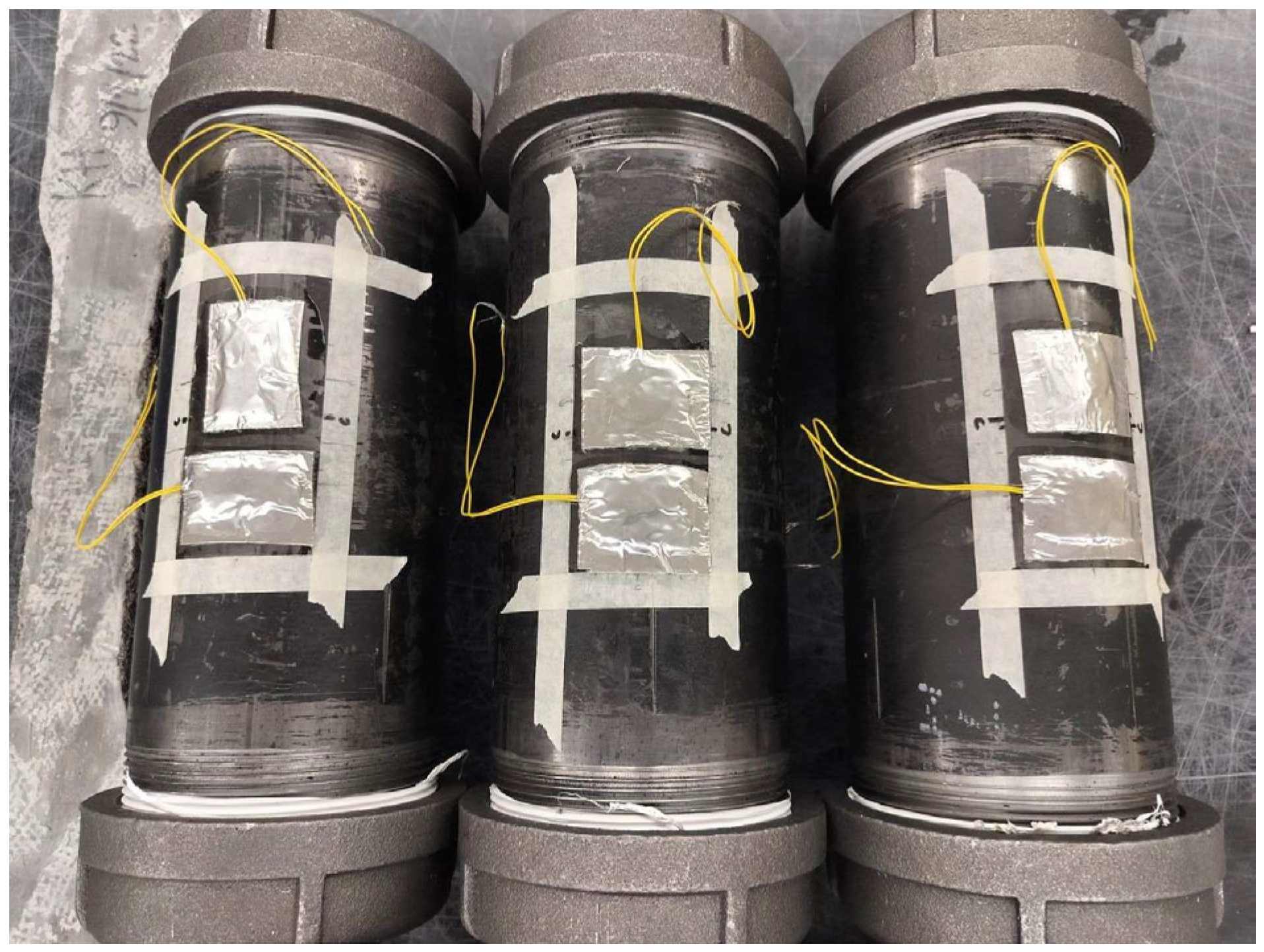- Steel cylinders without confinement, as shown in Figure 2: A baseline reference to study the steel cylinders’ response under internal pressure.