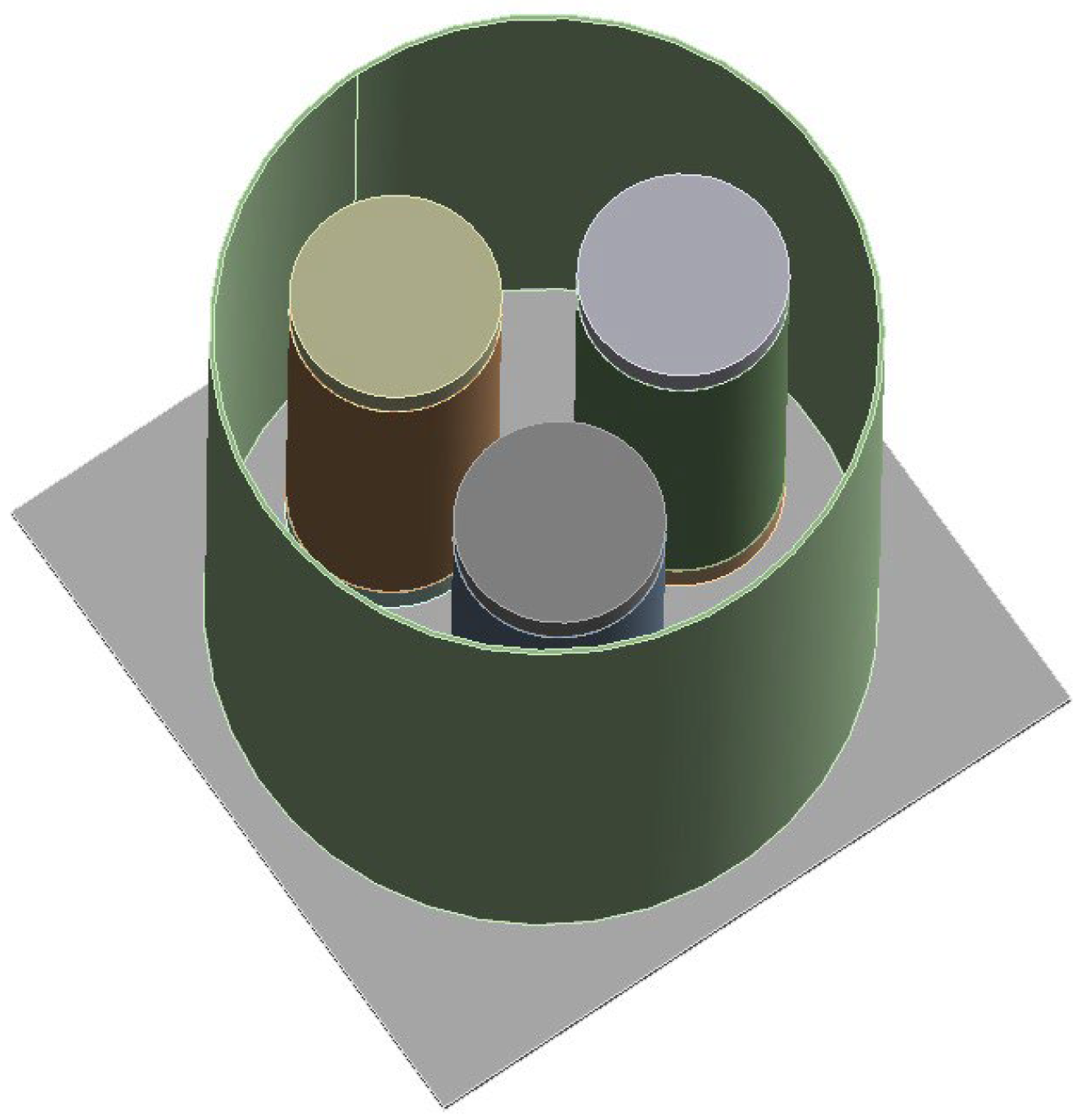 - Unconfined model: This model included only the three steel cylinders without any UHPC confinement. It served as a baseline to understand the behavior of the cylinders in the absence of external support. The 3D model for this configuration is shown in Figure 10.