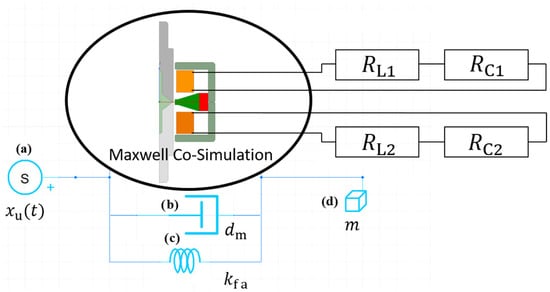 The simulation setup consists of a magnetically transient FEM simulation and were performed in Ansys Electronics Desktop 2023 R1 (Ansys, Inc., Canonsburg, PA, USA) using the Ansys Maxwell solver. It is coupled with mechanical and electrical co-simulations. The mechanical co-simulations (a–d) are implemented in Ansys Simplorer. Their structure, shown in Figure 6, follows the axial forces noted in Figure 4 and numerically solves the equation of motion (8). Specifically, (a) applies the base excitation , (b) implements the mechanical damping force using the damping coefficient , (c) incorporates the axial spring force with spring constant and (d) includes the mass of core (IV) and the connecting element (VIII), enabling the calculation of the inertial force . Within the Ansys Maxwell co-simulation, the axial reluctance force and the electromagnetic force are determined.