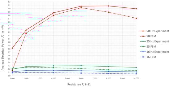 Figure 14 shows the mean electrical power as a function of the load resistance for excitation frequencies of , , and . Linear interpolation is applied between the six measurement points for each excitation frequency.