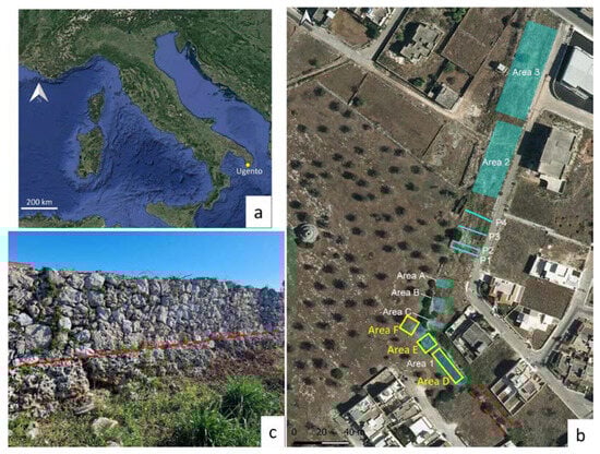(a) Ugento is located in the southern part of Salento. (b) The studied site is located in a peripheral area of the city: the green areas were investigated with the EM method, while the yellow rectangles-delimited areas were investigated with the GPR method; a section of visible city walls in the adjacent area is highlighted with red dashed lines. (c) The red dashed line highlights the modern dry stone walls over the ancient walls.