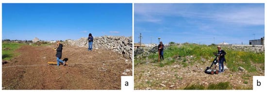 Geophysical campaigns carried out previously on Messapian sites [,] have shown excellent results in identifying buried structures [] and reconstructing a stretch of the Messapian city walls and nearby necropolis in the St. Antonio area of Ugento [].