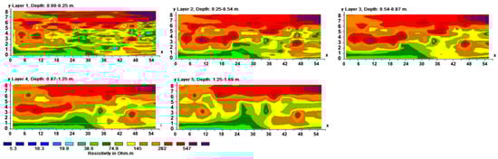 EM results provided the identification of several resistivity anomalies related to the presence of significant buried archaeological structures. Area 1 had dimensions of 57 × 8 m and was oriented in a NW–SE direction in correspondence with a corner of the Messapian city wall, which is buried and partially obliterated by a modern dry stone wall. In detail, the resistivity depth slices showed high resistivity anomalies (greater than 400 Ohm m) potentially related to the presence of buried structures; the elongated shape of these anomalies probably proves the presence of the buried city walls (named W). The presence of this trend was visible in all the layers obtained through the inversion process (Figure 3), i.e., at shallow depths up to a depth of z = 2 m. Other high resistivity anomalies (S) could be related to other structures, probably related to the walls.