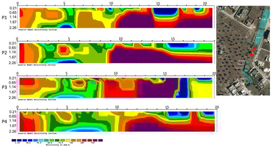 Distribution of the inverse electrical resistivity in profiles P1, P2, P3, and P4. The red arrows in the image on the right show the direction and verse of the acquisition.