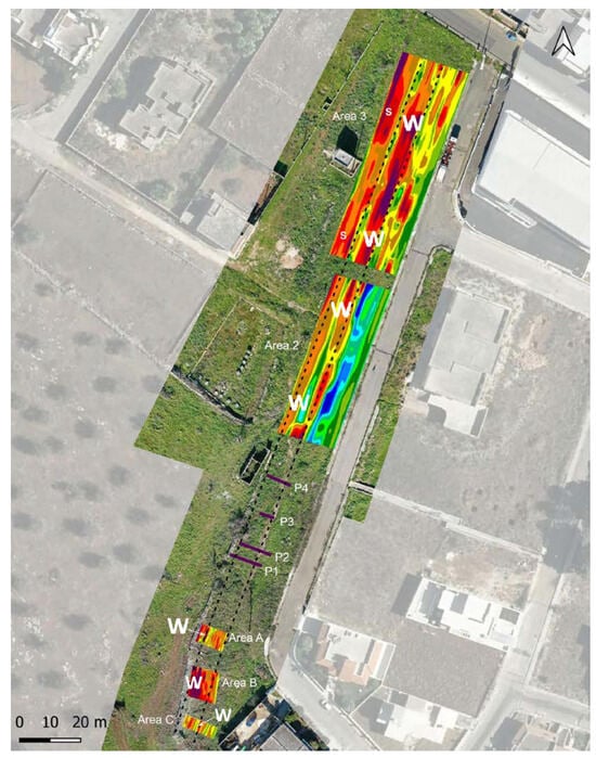 Depth slices relating to the depths of z = 0.87–1.25 m for Area 2 and Area 3 and depths of z = 0.54–0.87 for Area A, Area B, and Area C, georeferenced on drone orthophotos. The high resistivity anomalies (designated by colors from red to purple) named W refer to the buried city wall whose route is indicated by the black dashed line. The width of the anomalies referable to the city walls identified in the individual profiles (P1, P2, P3, and P4) is indicated in purple.