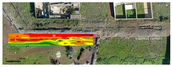 Area 1: georeferenced depth slice (depth of 0.87–1.25 m) over the drone orthophoto, with indication of the anomaly referable to the buried Messapian city walls (named W) and other anomalies probably referable to structures related to the buried walls (named S). The elongated high resistivity anomaly, designated by colors from red to purple (W) and indicated by the black dashed line, aligns with a section of visible city walls (external curtain) in the adjacent area.
