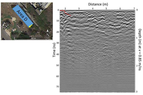 The last profile of Area D starts at a distance of 1.6 m from the start line of the grid due to obstacles on the surface (yellow arrow in the image on the left). The red dashed line highlights a shallow anomaly correlated to the presence of the wall.